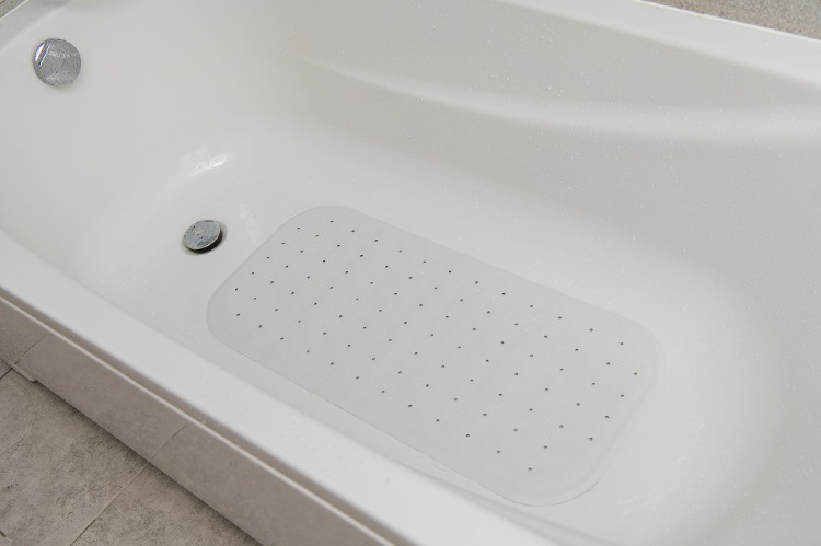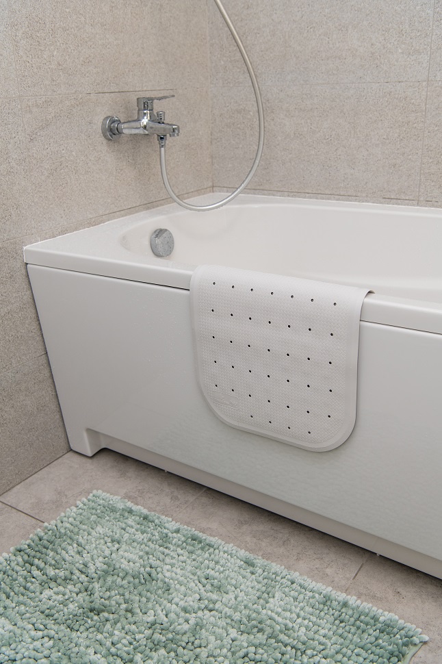 Коврик однотонный, не будет привлекать внимание малыша к дну ванной.